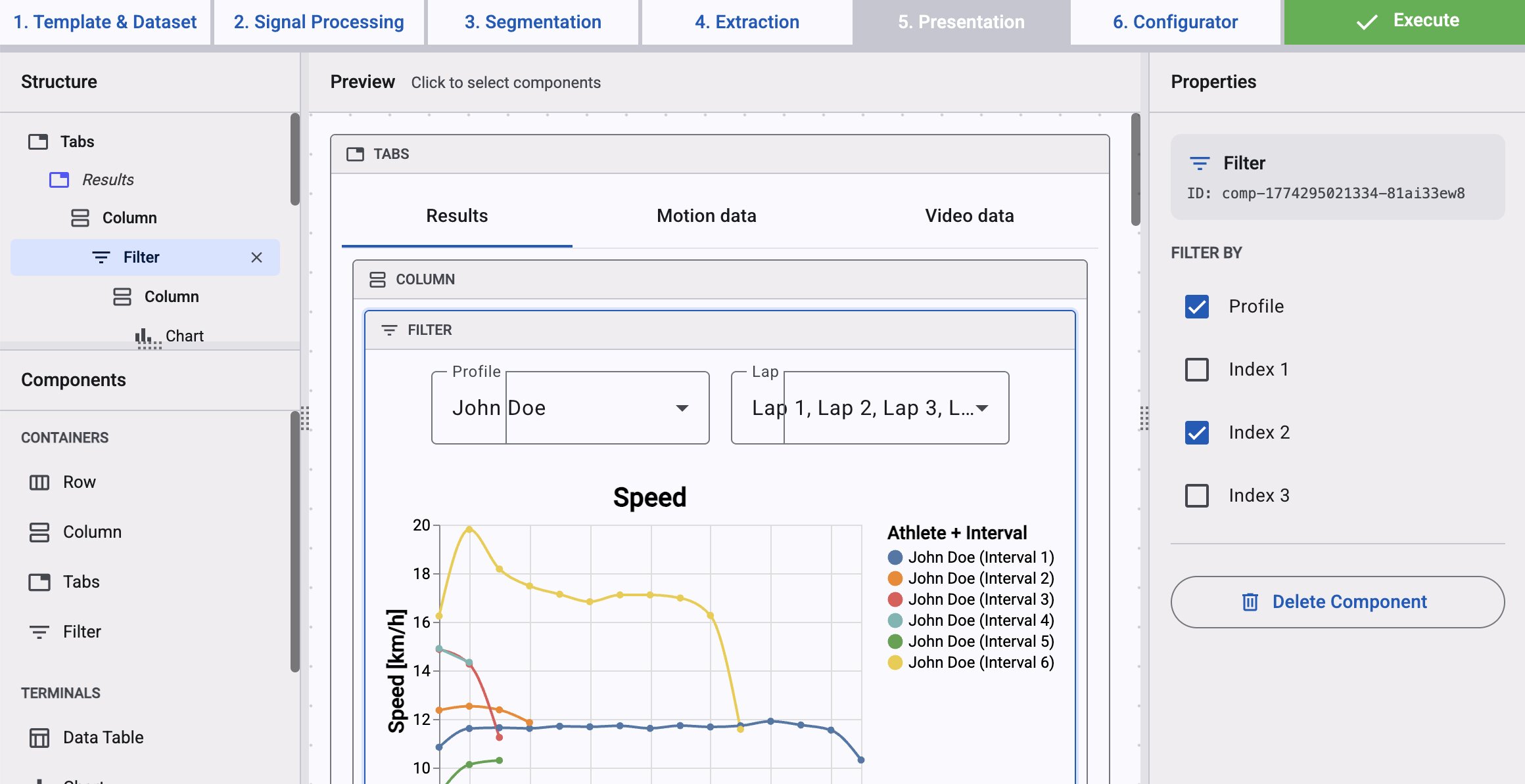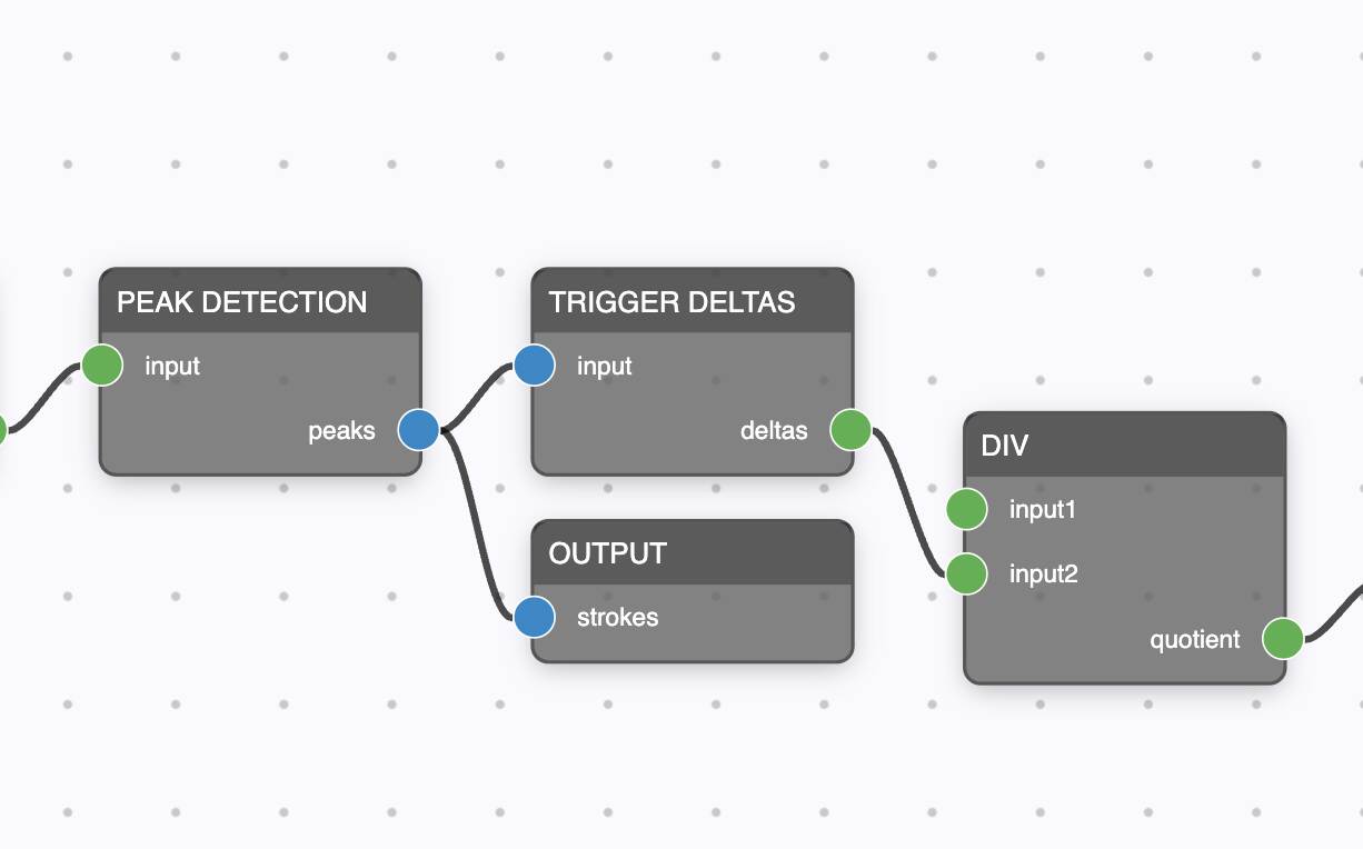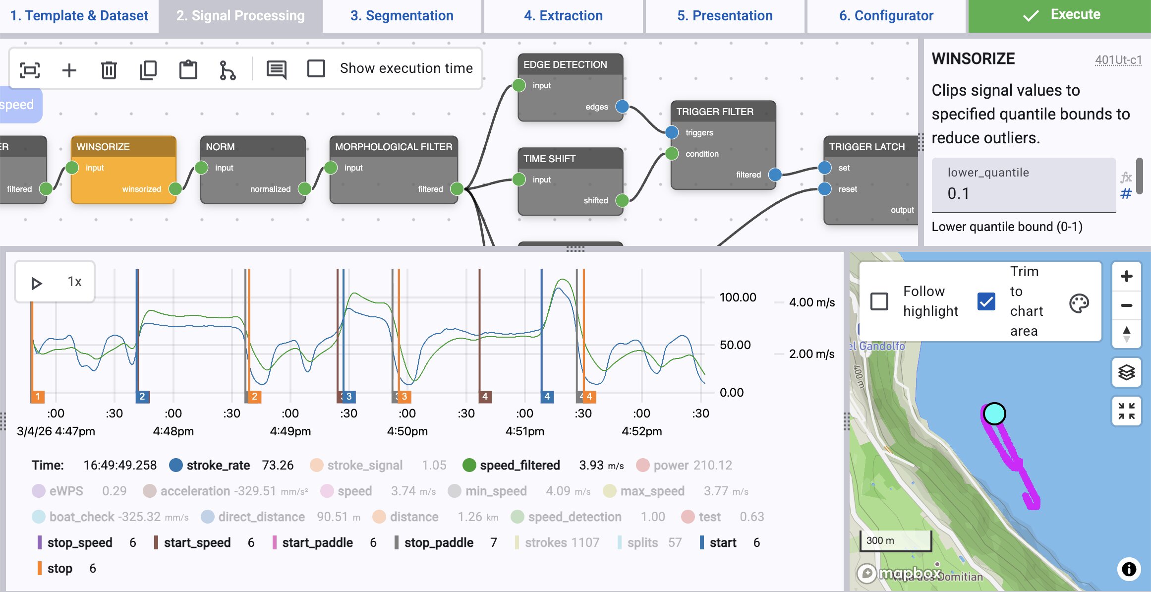 Componi pipeline da una libreria di funzioni di segnale — dall'aritmetica di base sui canali dei sensori agli algoritmi avanzati come il rilevamento di porte virtuali su mappa, rilevamento dei picchi e analisi frequenziale. I dati vengono automaticamente pre-elaborati e normalizzati. Tu ti concentri sulla scienza dello sport, Studio si occupa del resto.