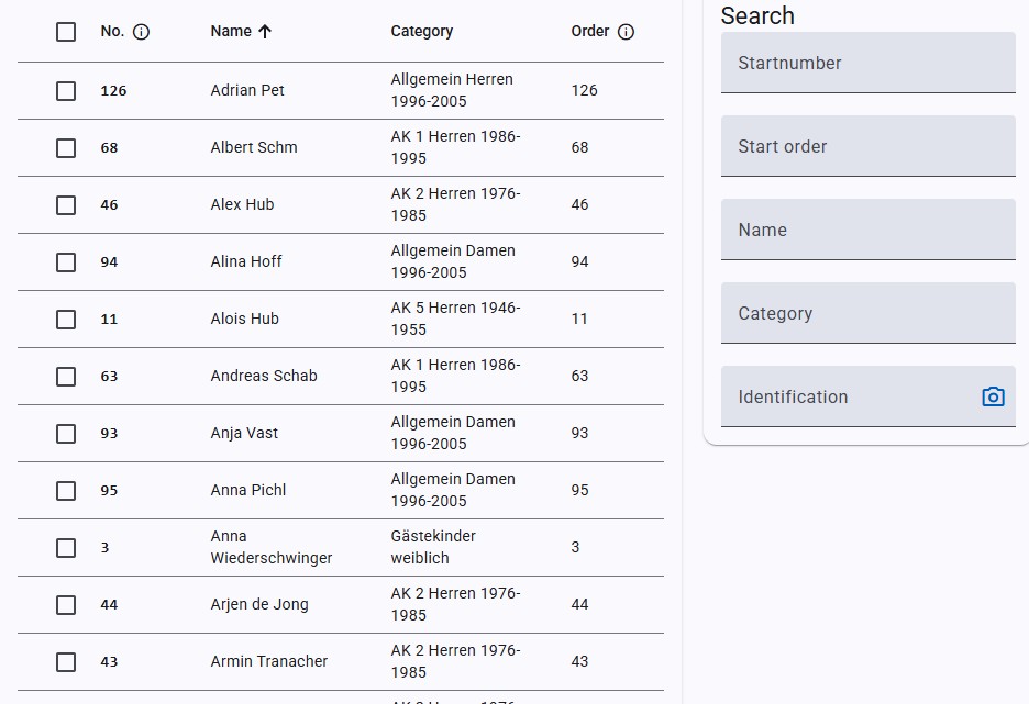 Durante la gara, tutte le misurazioni dei tempi arrivano nella web app in tempo reale. Vedi i tempi già misurati, il prossimo partente e la classifica attuale – tutto a colpo d'occhio, su qualsiasi dispositivo. Con un semplice clic sul tempo di corsa, può essere modificato e informazioni come DNF, DSQ o porta mancata possono essere registrate.